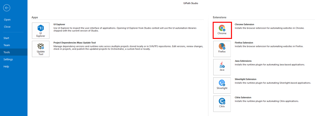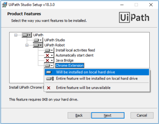 set up 실행 > Advanced > UiPath > UiPath Robot > Chrome Extension > Will be installed on local hard drive 선택