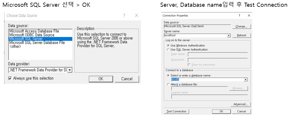 - SQL Server : Windows 인증 혹은 SQL Server로 접속 시 접속하고자 하는 계정 정보를 입력