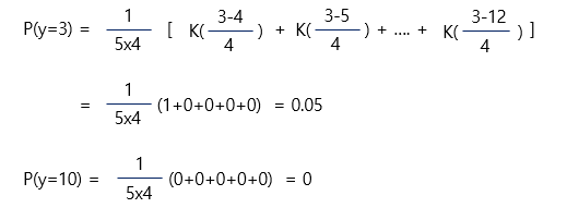 • 관측된 데이터 각각에 대한 데이터를 중심으로 하는 커널함수를 생성, 생성된 커널함수 값들을 모두 더한 후 전체 데이터 개수로 나눈다.