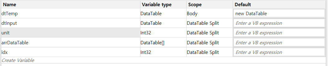 arrDataTable : 분할된 데이터 테이블을 할당할 배열